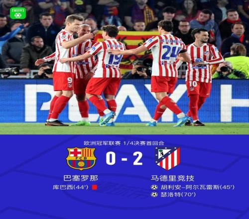 北京时间4月9日欧洲冠军联赛 1/4决赛首回合,巴塞罗那对阵马德里竞技。马德里竞技胡利安-阿尔瓦雷斯破门,瑟洛特破门。最终比分巴萨 0-2 马竞。