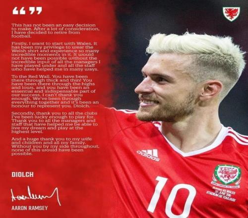回顾拉姆塞的职业生涯,对他而言,国家队的战袍始终排在第一位。他在退役声明中,首先感谢的正是威尔士:“这并不是个容易做出的决定。经过深思熟虑,我决定从足坛退役。首先,我想先谈谈威尔士。能身披威尔士战袍、经历无数精彩时刻,是我的荣幸。”